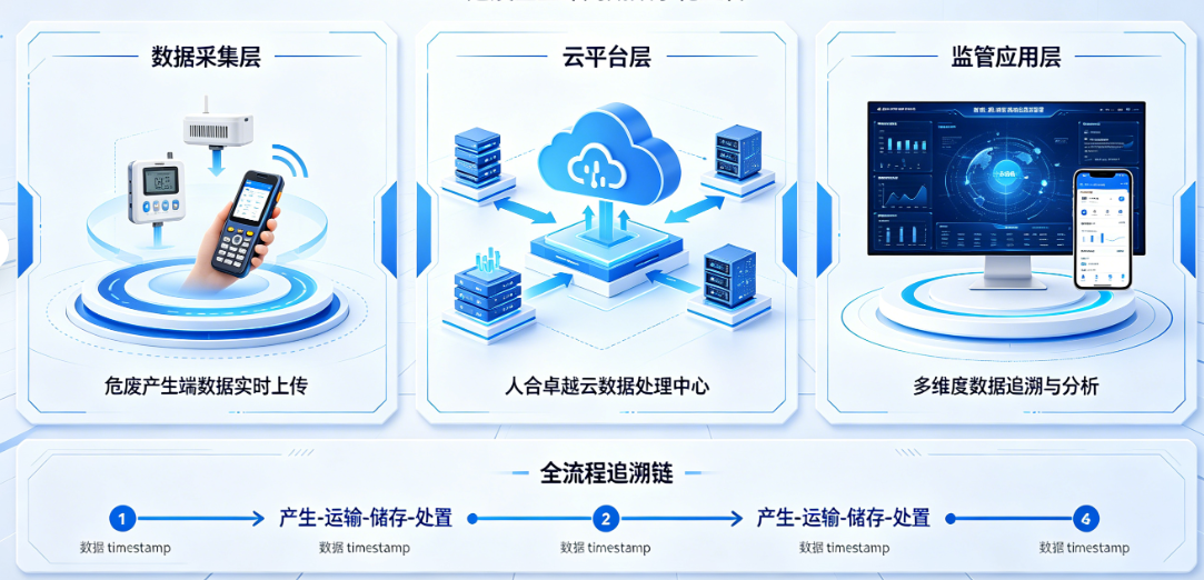 以全国危险废物全过程环境管理信息系统为数据核心,人合卓越云构建起危废全生命周期可追溯体系,覆盖产生、贮存、转移、处置四大环节,实现全流程闭环管控。
