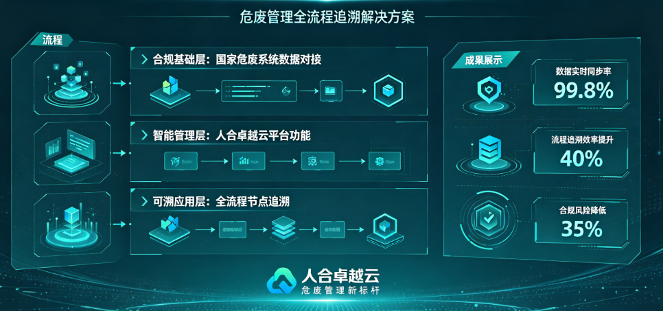 全流程可溯是危废智能管理的核心支撑。人合卓越云依托国家系统,构建智能化、精细化溯源体系,实现危废全生命周期智能追溯、全程可控。