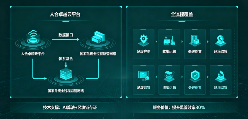 全面融入全国危险废物全过程环境管理信息系统这一国家危废监管主平台,是人合卓越云为企业打造的数字化合规底座。